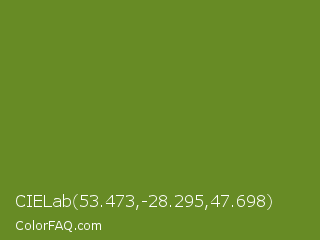 CIELab 53.473,-28.295,47.698 Color is a normal green color and the nearest color is Olive Drab #6b8e23. Hex code #678b25 and RGB value is rgb(103,139,37). In RGB color space, this color is composed of 40% red, 55% green, 15% blue, In CMYK color space, this color is composed of 26% cyan, 0% magenta, 73% yellow , 45% black , In HSL color space, this color has a hue angle of 81° , 58% saturation and 35% lightness.