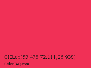 CIELab 53.478,72.111,26.938 Color is a normal red color and the nearest color is Desire #ea3c53. Hex code #f13056 and RGB value is rgb(241,48,86). In RGB color space, this color is composed of 95% red, 19% green, 34% blue, In CMYK color space, this color is composed of 0% cyan, 80% magenta, 64% yellow , 5% black , In HSL color space, this color has a hue angle of 348° , 87% saturation and 57% lightness.