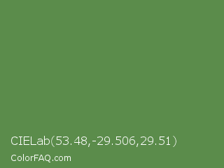 CIELab 53.48,-29.506,29.51 Color is a normal green color and the nearest color is Hippie Green #53824b. Hex code #5b8c4b and RGB value is rgb(91,140,75). In RGB color space, this color is composed of 36% red, 55% green, 29% blue, In CMYK color space, this color is composed of 35% cyan, 0% magenta, 46% yellow , 45% black , In HSL color space, this color has a hue angle of 105° , 30% saturation and 42% lightness.