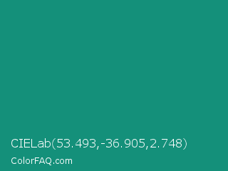 CIELab 53.493,-36.905,2.748 Color is a normal cyan color and the nearest color is Gossamer #069b81. Hex code #14907a and RGB value is rgb(20,144,122). In RGB color space, this color is composed of 8% red, 56% green, 48% blue, In CMYK color space, this color is composed of 86% cyan, 0% magenta, 15% yellow , 44% black , In HSL color space, this color has a hue angle of 169° , 76% saturation and 32% lightness.