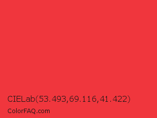 CIELab 53.493,69.116,41.422 Color is a normal red color and the nearest color is Deep Carmine Pink #ef3038. Hex code #f0363d and RGB value is rgb(240,54,61). In RGB color space, this color is composed of 94% red, 21% green, 24% blue, In CMYK color space, this color is composed of 0% cyan, 78% magenta, 75% yellow , 6% black , In HSL color space, this color has a hue angle of 358° , 86% saturation and 58% lightness.