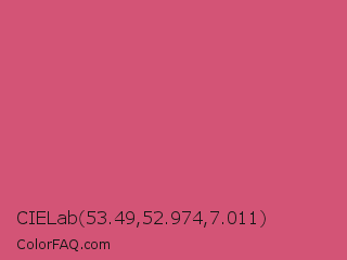 CIELab 53.49,52.974,7.011 Color is a normal rose color and the nearest color is Cranberry #db5079. Hex code #d35476 and RGB value is rgb(211,84,118). In RGB color space, this color is composed of 83% red, 33% green, 46% blue, In CMYK color space, this color is composed of 0% cyan, 60% magenta, 44% yellow , 17% black , In HSL color space, this color has a hue angle of 344° , 59% saturation and 58% lightness.