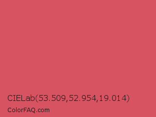 CIELab 53.509,52.954,19.014 Color is a normal red color and the nearest color is Mandy #e25465. Hex code #d75362 and RGB value is rgb(215,83,98). In RGB color space, this color is composed of 84% red, 33% green, 38% blue, In CMYK color space, this color is composed of 0% cyan, 61% magenta, 54% yellow , 16% black , In HSL color space, this color has a hue angle of 353° , 62% saturation and 58% lightness.
