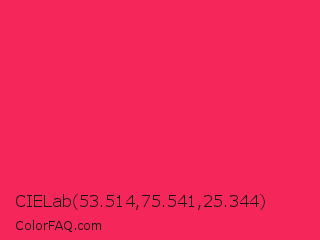CIELab 53.514,75.541,25.344 Color is a normal red color and the nearest color is Awesome #ff2052. Hex code #f52659 and RGB value is rgb(245,38,89). In RGB color space, this color is composed of 96% red, 15% green, 35% blue, In CMYK color space, this color is composed of 0% cyan, 84% magenta, 64% yellow , 4% black , In HSL color space, this color has a hue angle of 345° , 91% saturation and 55% lightness.