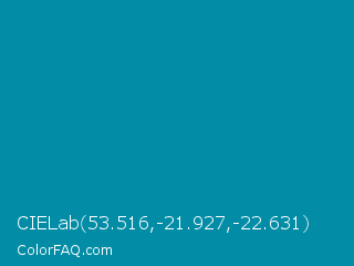 CIELab 53.516,-21.927,-22.631 Color is a normal cyan color and the nearest color is Blue Munsell #0093af. Hex code #028ca6 and RGB value is rgb(2,140,166). In RGB color space, this color is composed of 1% red, 55% green, 65% blue, In CMYK color space, this color is composed of 99% cyan, 16% magenta, 0% yellow , 35% black , In HSL color space, this color has a hue angle of 190° , 98% saturation and 33% lightness.