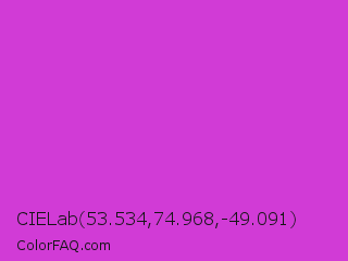 CIELab 53.534,74.968,-49.091 Color is a normal magenta color and the nearest color is Steel Pink #cc33cc. Hex code #d13bd6 and RGB value is rgb(209,59,214). In RGB color space, this color is composed of 82% red, 23% green, 84% blue, In CMYK color space, this color is composed of 2% cyan, 72% magenta, 0% yellow , 16% black , In HSL color space, this color has a hue angle of 298° , 65% saturation and 54% lightness.