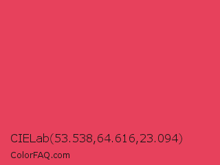 CIELab 53.538,64.616,23.094 Color is a normal red color and the nearest color is Paradise Pink #e63e62. Hex code #e7415c and RGB value is rgb(231,65,92). In RGB color space, this color is composed of 91% red, 25% green, 36% blue, In CMYK color space, this color is composed of 0% cyan, 72% magenta, 60% yellow , 9% black , In HSL color space, this color has a hue angle of 350° , 78% saturation and 58% lightness.