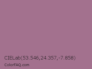 CIELab 53.546,24.357,-7.858 Color is a normal magenta color and the nearest color is Mountbatten Pink #997a8d. Hex code #a3718e and RGB value is rgb(163,113,142). In RGB color space, this color is composed of 64% red, 44% green, 56% blue, In CMYK color space, this color is composed of 0% cyan, 31% magenta, 13% yellow , 36% black , In HSL color space, this color has a hue angle of 325° , 21% saturation and 54% lightness.