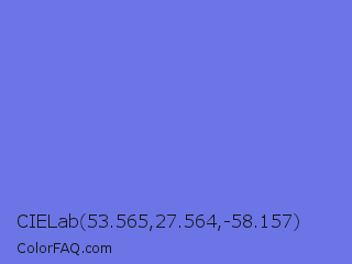 CIELab 53.565,27.564,-58.157 Color is a light blue color and the nearest color is Medium Slate Blue #7b68ee. Hex code #6c75e5 and RGB value is rgb(108,117,229). In RGB color space, this color is composed of 42% red, 46% green, 90% blue, In CMYK color space, this color is composed of 53% cyan, 49% magenta, 0% yellow , 10% black , In HSL color space, this color has a hue angle of 236° , 70% saturation and 66% lightness.