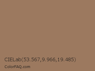 CIELab 53.567,9.966,19.485 Color is a normal orange color and the nearest color is Chamoisee #a0785a. Hex code #9c795f and RGB value is rgb(156,121,95). In RGB color space, this color is composed of 61% red, 47% green, 37% blue, In CMYK color space, this color is composed of 0% cyan, 22% magenta, 39% yellow , 39% black , In HSL color space, this color has a hue angle of 26° , 24% saturation and 49% lightness.