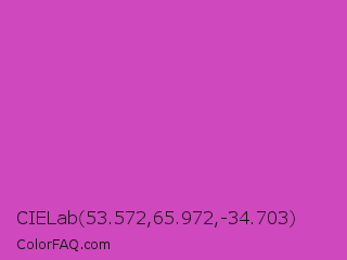 CIELab 53.572,65.972,-34.703 Color is a normal magenta color and the nearest color is Fuchsia Pink #c154c1. Hex code #cf48bd and RGB value is rgb(207,72,189). In RGB color space, this color is composed of 81% red, 28% green, 74% blue, In CMYK color space, this color is composed of 0% cyan, 65% magenta, 9% yellow , 19% black , In HSL color space, this color has a hue angle of 308° , 58% saturation and 55% lightness.