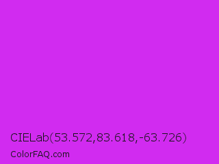 CIELab 53.572,83.618,-63.726 Color is a normal purple color and the nearest color is Steel Pink #cc33cc. Hex code #d12bf0 and RGB value is rgb(209,43,240). In RGB color space, this color is composed of 82% red, 17% green, 94% blue, In CMYK color space, this color is composed of 13% cyan, 82% magenta, 0% yellow , 6% black , In HSL color space, this color has a hue angle of 291° , 87% saturation and 55% lightness.