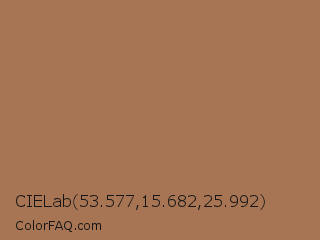 CIELab 53.577,15.682,25.992 Color is a normal orange color and the nearest color is French Beige #a67b5b. Hex code #a77554 and RGB value is rgb(167,117,84). In RGB color space, this color is composed of 65% red, 46% green, 33% blue, In CMYK color space, this color is composed of 0% cyan, 30% magenta, 50% yellow , 35% black , In HSL color space, this color has a hue angle of 24° , 33% saturation and 49% lightness.