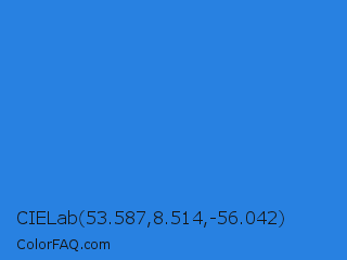 CIELab 53.587,8.514,-56.042 Color is a normal blue color and the nearest color is Bleu De France #318ce7. Hex code #2881e1 and RGB value is rgb(40,129,225). In RGB color space, this color is composed of 16% red, 51% green, 88% blue, In CMYK color space, this color is composed of 82% cyan, 43% magenta, 0% yellow , 12% black , In HSL color space, this color has a hue angle of 211° , 76% saturation and 52% lightness.