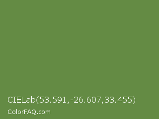 CIELab 53.591,-26.607,33.455 Color is a normal green color and the nearest color is Palm Leaf #6f9940. Hex code #648b44 and RGB value is rgb(100,139,68). In RGB color space, this color is composed of 39% red, 55% green, 27% blue, In CMYK color space, this color is composed of 28% cyan, 0% magenta, 51% yellow , 45% black , In HSL color space, this color has a hue angle of 93° , 34% saturation and 41% lightness.