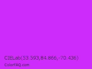 CIELab 53.593,84.866,-70.436 Color is a normal purple color and the nearest color is Vivid Orchid #cc00ff. Hex code #cc2bfc and RGB value is rgb(204,43,252). In RGB color space, this color is composed of 80% red, 17% green, 99% blue, In CMYK color space, this color is composed of 19% cyan, 83% magenta, 0% yellow , 1% black , In HSL color space, this color has a hue angle of 286° , 97% saturation and 58% lightness.