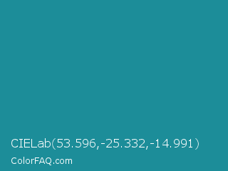 CIELab 53.596,-25.332,-14.991 Color is a normal cyan color and the nearest color is Blue Chill #0c8990. Hex code #1c8d99 and RGB value is rgb(28,141,153). In RGB color space, this color is composed of 11% red, 55% green, 60% blue, In CMYK color space, this color is composed of 82% cyan, 8% magenta, 0% yellow , 40% black , In HSL color space, this color has a hue angle of 186° , 69% saturation and 35% lightness.