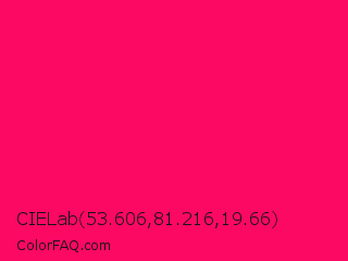 CIELab 53.606,81.216,19.66 Color is a normal rose color and the nearest color is Vivid Raspberry #ff006c. Hex code #fb0963 and RGB value is rgb(251,9,99). In RGB color space, this color is composed of 98% red, 4% green, 39% blue, In CMYK color space, this color is composed of 0% cyan, 96% magenta, 61% yellow , 2% black , In HSL color space, this color has a hue angle of 338° , 97% saturation and 51% lightness.