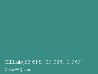 CIELab 53.616,-27.284,-2.747 Color is a normal cyan color and the nearest color is Lochinvar #2c8c84. Hex code #3a8d84 and RGB value is rgb(58,141,132). In RGB color space, this color is composed of 23% red, 55% green, 52% blue, In CMYK color space, this color is composed of 59% cyan, 0% magenta, 6% yellow , 45% black , In HSL color space, this color has a hue angle of 173° , 42% saturation and 39% lightness.