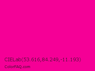 CIELab 53.616,84.249,-11.193 Color is a normal magenta color and the nearest color is Hollywood Cerise #f400a1. Hex code #f50096 and RGB value is rgb(245,0,150). In RGB color space, this color is composed of 96% red, 0% green, 59% blue, In CMYK color space, this color is composed of 0% cyan, 100% magenta, 39% yellow , 4% black , In HSL color space, this color has a hue angle of 323° , 100% saturation and 48% lightness.