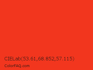 CIELab 53.61,68.852,57.115 Color is a normal red color and the nearest color is Pomegranate #f34723. Hex code #f2361e and RGB value is rgb(242,54,30). In RGB color space, this color is composed of 95% red, 21% green, 12% blue, In CMYK color space, this color is composed of 0% cyan, 78% magenta, 88% yellow , 5% black , In HSL color space, this color has a hue angle of 7° , 89% saturation and 53% lightness.