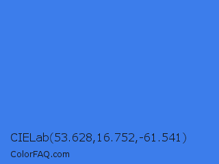 CIELab 53.628,16.752,-61.541 Color is a normal blue color and the nearest color is Bleu De France #318ce7. Hex code #3c7deb and RGB value is rgb(60,125,235). In RGB color space, this color is composed of 24% red, 49% green, 92% blue, In CMYK color space, this color is composed of 74% cyan, 47% magenta, 0% yellow , 8% black , In HSL color space, this color has a hue angle of 218° , 81% saturation and 58% lightness.