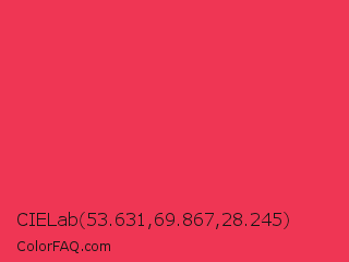 CIELab 53.631,69.867,28.245 Color is a normal red color and the nearest color is Desire #ea3c53. Hex code #ef3654 and RGB value is rgb(239,54,84). In RGB color space, this color is composed of 94% red, 21% green, 33% blue, In CMYK color space, this color is composed of 0% cyan, 77% magenta, 65% yellow , 6% black , In HSL color space, this color has a hue angle of 350° , 85% saturation and 57% lightness.
