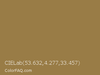 CIELab 53.632,4.277,33.457 Color is a normal orange color and the nearest color is Metallic Sunburst #9c7c38. Hex code #997c46 and RGB value is rgb(153,124,70). In RGB color space, this color is composed of 60% red, 49% green, 27% blue, In CMYK color space, this color is composed of 0% cyan, 19% magenta, 54% yellow , 40% black , In HSL color space, this color has a hue angle of 39° , 37% saturation and 44% lightness.