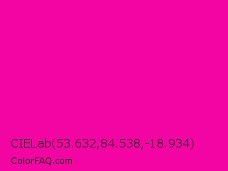 CIELab 53.632,84.538,-18.934 Color is a normal magenta color and the nearest color is Hollywood Cerise #f400a1. Hex code #f205a3 and RGB value is rgb(242,5,163). In RGB color space, this color is composed of 95% red, 2% green, 64% blue, In CMYK color space, this color is composed of 0% cyan, 98% magenta, 33% yellow , 5% black , In HSL color space, this color has a hue angle of 320° , 96% saturation and 48% lightness.