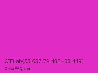CIELab 53.637,79.482,-38.449 Color is a normal magenta color and the nearest color is Steel Pink #cc33cc. Hex code #e02cc4 and RGB value is rgb(224,44,196). In RGB color space, this color is composed of 88% red, 17% green, 77% blue, In CMYK color space, this color is composed of 0% cyan, 80% magenta, 13% yellow , 12% black , In HSL color space, this color has a hue angle of 309° , 74% saturation and 53% lightness.