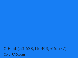 CIELab 53.638,16.493,-66.577 Color is a normal blue color and the nearest color is Blue Crayola #1f75fe. Hex code #177ef4 and RGB value is rgb(23,126,244). In RGB color space, this color is composed of 9% red, 49% green, 96% blue, In CMYK color space, this color is composed of 91% cyan, 48% magenta, 0% yellow , 4% black , In HSL color space, this color has a hue angle of 212° , 91% saturation and 52% lightness.
