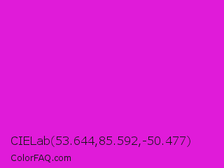 CIELab 53.644,85.592,-50.477 Color is a normal magenta color and the nearest color is Hot Magenta #ff1dce. Hex code #e01bd9 and RGB value is rgb(224,27,217). In RGB color space, this color is composed of 88% red, 11% green, 85% blue, In CMYK color space, this color is composed of 0% cyan, 88% magenta, 3% yellow , 12% black , In HSL color space, this color has a hue angle of 302° , 78% saturation and 49% lightness.