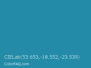 CIELab 53.653,-18.552,-23.539 Color is a normal cyan color and the nearest color is Eastern Blue #1e9ab0. Hex code #238ba8 and RGB value is rgb(35,139,168). In RGB color space, this color is composed of 14% red, 55% green, 66% blue, In CMYK color space, this color is composed of 79% cyan, 17% magenta, 0% yellow , 34% black , In HSL color space, this color has a hue angle of 193° , 66% saturation and 40% lightness.