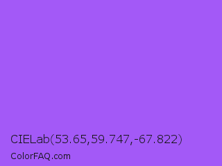 CIELab 53.65,59.747,-67.822 Color is a light violet color and the nearest color is Navy Purple #9457eb. Hex code #a359f7 and RGB value is rgb(163,89,247). In RGB color space, this color is composed of 64% red, 35% green, 97% blue, In CMYK color space, this color is composed of 34% cyan, 64% magenta, 0% yellow , 3% black , In HSL color space, this color has a hue angle of 268° , 91% saturation and 66% lightness.