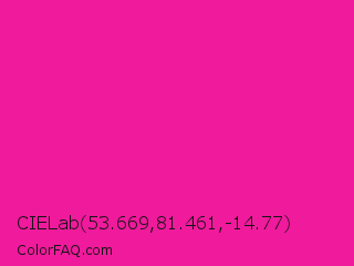 CIELab 53.669,81.461,-14.77 Color is a normal magenta color and the nearest color is Fluorescent Pink #ff1493. Hex code #f01a9c and RGB value is rgb(240,26,156). In RGB color space, this color is composed of 94% red, 10% green, 61% blue, In CMYK color space, this color is composed of 0% cyan, 89% magenta, 35% yellow , 6% black , In HSL color space, this color has a hue angle of 324° , 88% saturation and 52% lightness.