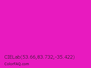 CIELab 53.66,83.732,-35.422 Color is a normal magenta color and the nearest color is Shocking Pink #fc0fc0. Hex code #e81abf and RGB value is rgb(232,26,191). In RGB color space, this color is composed of 91% red, 10% green, 75% blue, In CMYK color space, this color is composed of 0% cyan, 89% magenta, 18% yellow , 9% black , In HSL color space, this color has a hue angle of 312° , 82% saturation and 51% lightness.