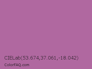 CIELab 53.674,37.061,-18.042 Color is a normal magenta color and the nearest color is Pearly Purple #b768a2. Hex code #b068a0 and RGB value is rgb(176,104,160). In RGB color space, this color is composed of 69% red, 41% green, 63% blue, In CMYK color space, this color is composed of 0% cyan, 41% magenta, 9% yellow , 31% black , In HSL color space, this color has a hue angle of 313° , 31% saturation and 55% lightness.