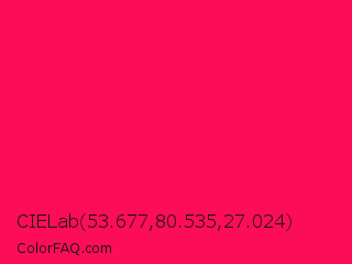 CIELab 53.677,80.535,27.024 Color is a normal rose color and the nearest color is Folly #ff004f. Hex code #fc0d57 and RGB value is rgb(252,13,87). In RGB color space, this color is composed of 99% red, 5% green, 34% blue, In CMYK color space, this color is composed of 0% cyan, 95% magenta, 65% yellow , 1% black , In HSL color space, this color has a hue angle of 341° , 98% saturation and 52% lightness.