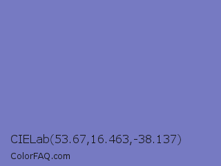 CIELab 53.67,16.463,-38.137 Color is a light blue color and the nearest color is Toolbox #746cc0. Hex code #767ac2 and RGB value is rgb(118,122,194). In RGB color space, this color is composed of 46% red, 48% green, 76% blue, In CMYK color space, this color is composed of 39% cyan, 37% magenta, 0% yellow , 24% black , In HSL color space, this color has a hue angle of 237° , 38% saturation and 61% lightness.