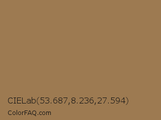 CIELab 53.687,8.236,27.594 Color is a normal orange color and the nearest color is Dirt #9b7653. Hex code #9d7a51 and RGB value is rgb(157,122,81). In RGB color space, this color is composed of 62% red, 48% green, 32% blue, In CMYK color space, this color is composed of 0% cyan, 22% magenta, 48% yellow , 38% black , In HSL color space, this color has a hue angle of 32° , 32% saturation and 47% lightness.