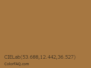 CIELab 53.688,12.442,36.527 Color is a normal orange color and the nearest color is Metallic Sunburst #9c7c38. Hex code #a67741 and RGB value is rgb(166,119,65). In RGB color space, this color is composed of 65% red, 47% green, 25% blue, In CMYK color space, this color is composed of 0% cyan, 28% magenta, 61% yellow , 35% black , In HSL color space, this color has a hue angle of 32° , 44% saturation and 45% lightness.