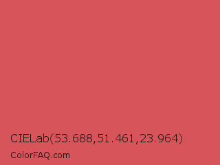CIELab 53.688,51.461,23.964 Color is a normal red color and the nearest color is Chestnut Rose #cd5c5c. Hex code #d7555a and RGB value is rgb(215,85,90). In RGB color space, this color is composed of 84% red, 33% green, 35% blue, In CMYK color space, this color is composed of 0% cyan, 60% magenta, 58% yellow , 16% black , In HSL color space, this color has a hue angle of 358° , 62% saturation and 59% lightness.