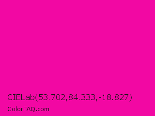 CIELab 53.702,84.333,-18.827 Color is a normal magenta color and the nearest color is Hollywood Cerise #f400a1. Hex code #f208a3 and RGB value is rgb(242,8,163). In RGB color space, this color is composed of 95% red, 3% green, 64% blue, In CMYK color space, this color is composed of 0% cyan, 97% magenta, 33% yellow , 5% black , In HSL color space, this color has a hue angle of 320° , 94% saturation and 49% lightness.
