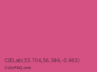 CIELab 53.704,56.384,-0.963 Color is a normal rose color and the nearest color is Mystic #d65282. Hex code #d55184 and RGB value is rgb(213,81,132). In RGB color space, this color is composed of 84% red, 32% green, 52% blue, In CMYK color space, this color is composed of 0% cyan, 62% magenta, 38% yellow , 16% black , In HSL color space, this color has a hue angle of 337° , 61% saturation and 58% lightness.