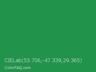 CIELab 53.706,-47.339,29.365 Color is a normal green color and the nearest color is Eucalyptus #278a5b. Hex code #21934b and RGB value is rgb(33,147,75). In RGB color space, this color is composed of 13% red, 58% green, 29% blue, In CMYK color space, this color is composed of 78% cyan, 0% magenta, 49% yellow , 42% black , In HSL color space, this color has a hue angle of 142° , 63% saturation and 35% lightness.
