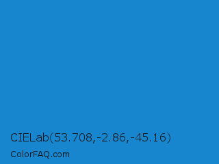 CIELab 53.708,-2.86,-45.16 Color is a normal blue color and the nearest color is Cyan Cornflower Blue #188bc2. Hex code #1886ce and RGB value is rgb(24,134,206). In RGB color space, this color is composed of 9% red, 53% green, 81% blue, In CMYK color space, this color is composed of 88% cyan, 35% magenta, 0% yellow , 19% black , In HSL color space, this color has a hue angle of 204° , 79% saturation and 45% lightness.
