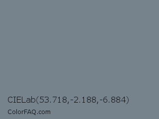 CIELab 53.718,-2.188,-6.884 Color is a normal blue color and the nearest color is Slate Gray #708090. Hex code #76828c and RGB value is rgb(118,130,140). In RGB color space, this color is composed of 46% red, 51% green, 55% blue, In CMYK color space, this color is composed of 16% cyan, 7% magenta, 0% yellow , 45% black , In HSL color space, this color has a hue angle of 207° , 9% saturation and 51% lightness.