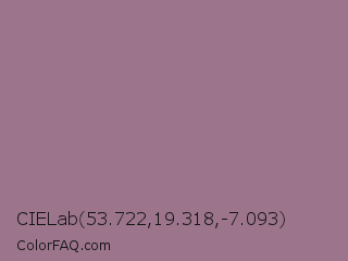 CIELab 53.722,19.318,-7.093 Color is a normal magenta color and the nearest color is Mountbatten Pink #997a8d. Hex code #9c758d and RGB value is rgb(156,117,141). In RGB color space, this color is composed of 61% red, 46% green, 55% blue, In CMYK color space, this color is composed of 0% cyan, 25% magenta, 10% yellow , 39% black , In HSL color space, this color has a hue angle of 323° , 16% saturation and 54% lightness.