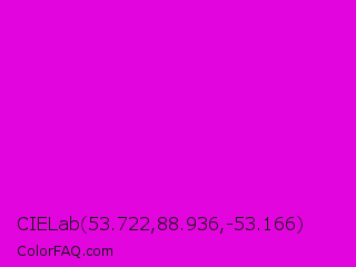 CIELab 53.722,88.936,-53.166 Color is a normal magenta color and the nearest color is Deep Magenta #cc00cc. Hex code #e305de and RGB value is rgb(227,5,222). In RGB color space, this color is composed of 89% red, 2% green, 87% blue, In CMYK color space, this color is composed of 0% cyan, 98% magenta, 2% yellow , 11% black , In HSL color space, this color has a hue angle of 301° , 96% saturation and 45% lightness.