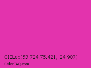 CIELab 53.724,75.421,-24.907 Color is a normal magenta color and the nearest color is Frostbite #e936a7. Hex code #e333ad and RGB value is rgb(227,51,173). In RGB color space, this color is composed of 89% red, 20% green, 68% blue, In CMYK color space, this color is composed of 0% cyan, 78% magenta, 24% yellow , 11% black , In HSL color space, this color has a hue angle of 318° , 76% saturation and 55% lightness.
